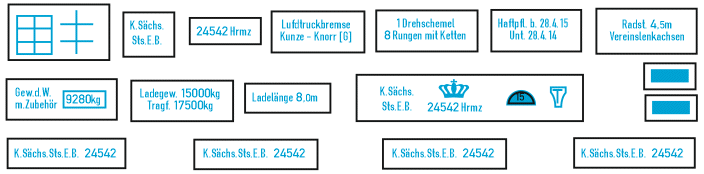 Decal TT für Drehschemelwagen Sächsische Staatseisenbahn Ep. 1 - Bausatz Anleitung für Decals Die vorliegenden Decals sind für einen Drehschemelwagen der Vereinsbauart des deutschen Wagenverbandes in der Beschriftung der Sächsischen Staatseisenbahn in Epoche 1. Die zugehörigen Wagenbausätze finden sie unter unseren Artikelnummern 400182 und 400192. Die Wagen mit der DRG-Bauartbezeichnung „Regensburg“, Gattungszeichen H, nach Musterzeichnung A5, wurden zwischen 1913 und 1925 in einer Stückzahl weit über 8000 geliefert. Die Drehsschemelwagen wurden meist paarweise gekuppelt und zum Transport von Langholz, später auch Schienenjochen eingesetzt. Der Wagen ist in ungebremster und gebremster Variante, letztere mit Bremserbühne und wahlweise Bremserhaus verfügbar. Die Decals sind für alle Varianten einsetzbar. Es gab in der Beschriftung keine Unterschiede.