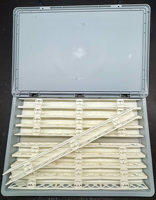 Transportbox Spur TT bestehend aus orig. AUER EuroBox mit Deckel (ED 64/75 HG), 9x Transporteinsatz extra lang, 5m Moosgummi 4mm, 3m Moosgummi 5mm Transportbox für Spur TT rollendes Material. Für horizontralen Transport geeignet. Keine Versandbox / Verpackung !!