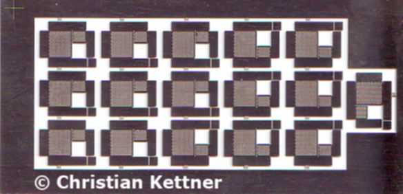 Ätzteil TT Weichenantriebskästen - Bausatz Neusilberplatine (Dicke 0,2mm) mit 8 rechten und 8 linken Weichenantriebskästen. Die Kästen sindmaßstäblich (TT), der Kastendeckel ist aus Riffelblech.