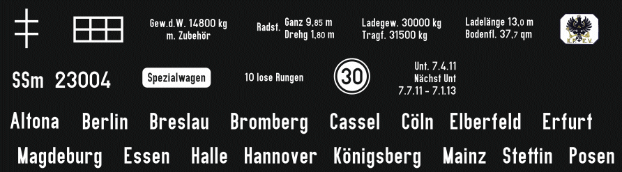 Decal TT für den Schienenwagen SSk Köln (401012) Epoche 1 Preussen - Bausatz Der Decalsatz dient zur Beschriftung des SSk Köln (Art.Nr. 401012) in Epoche 1 Preussen. Die einzelnen Decals werden in der Reihenfolge des Bildes von links oben nach rechts auf dem Langträger von links beginnend aufgebracht. Dabei ist die Untersuchungsanschrift die letzte ganz rechts auf dem Langträger. Die Städtenamen auf dem Decalbogen sind fast alle preussischen Direktionen. Davon ist eine auszuwählen und vor der Nummer anzubringen. Direktion, die Gattung SSm und die Wagennummer sind dabei mittig am Langträger.