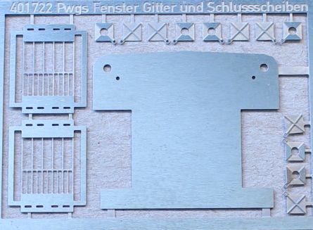 Ätzteil TT für die Superung des Pwgs 56 mit gefrästen Fenstern Fenstergittern und Schlussscheiben - Bausatz Bausatz für die Superung des Pwgs 56 mit gefrästen Fenstern, Fenstergittern und Schlussscheiben. Die Fenster sind aus dem Fenstersatz an den abgesetzten Fräskanten heraus zu brechen. Mit einer Flachzange können die Reste der Zwischenstege abgebrochen werden. Beim Kanzelfenster oben und bei den zu vergitternden Fenstern oben und unten, dürfen keine Reste stehen bleiben - eventuell glatt feilen. Die Fenstergitter werden an der Perforation abgewinkelt und von innen über das Fenster gestülpt. Vor dem Einbau der Fenster müssen störende Halterungen der alten Fenster mit Skalpell oder Drehmel vorsichtig entfernt werden. Zum Fixieren der Fenster eignet sich Holzleim gut. Die Schlusscheibenklappen auf einen 0,3mm Bronzedraht fädeln und festlöten. So können sie beweglich gestaltet werden. Um den Draht genau senkrecht zu stellen, ein senkrechtes Sackloch in ein Stück Holz einbringen und eingesteckt verlöten. Zum korrekten Bohren der Löcher für den 0,3er Draht und die Beleuchtungsöffnung liegt eine Bohrschablone bei. Sie wird unten abgewinkelt und kann an der Gehäuseunterkante angelegt werden. Die angespritzten Schlussscheiben vorher vorsichtig mit dem Skalpell oder einem Schaber entfernen. In die Beleuchtungsöffnung kann dann ein 1,0 mm Lichtleiter eingesetzt werden. Zur weiteren Superung des Modells finden sie in unserem Shop unter den Artikelnummern 401522 und 402722 Fahrwerke mit korrektem Achsstand und filigraner Ausführung, wobei letztere Artikelnummer zum Bau eines Fahrwerks mit Strohmabnahme über alle Radscheiben bietet.