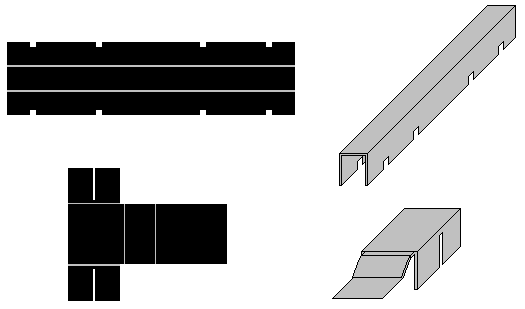 Ätzteil TT - Modulschablone für alle gängigen Kopfstückprofile des FKTT - Bausatz Geätzte Schablone aus 0,3mm Neusilberblech zum Ausrichten der Gleislage an Modulübergängen nach FKTT-Norm. Mit der Schablone lassen sich die Modulübergänge bei allen bekannten Normkopfstücken des FKTT (eingleisig, zweigleisig, I-Bahn) ausrichten. Die Schablone wird dazu an den Kopfstückbohrungen mit z.B. 2 10mm Bohrerschäften fixiert. Der geätzten FKTT-Schablone liegen noch zwei kleinere Bleche bei, die bei der Ausrichtung der Gleise helfen sollen. Das längliche Blech wird zu einem U gefaltet und dient zum Justieren des korrekten Gleismittenabstands von 34mm bei zweigleisiger Strecke. Das zweite Blech wird wie skizziert gefaltet. An der FKTT-Schablone befinden sich über den Gleisen zwei kleine eingeätzte Nuten. In diese wird das Teil eingesteckt (seitliche Schlitze) und hilft bei der rechtwinkligen Ausrichtung der Gleise.