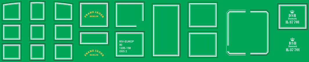 Decal TT für Tresorwagen der Olsenbande mit weißen Zierleisen - Bausatz Die Zierlinien sind bei diesem Artikel in Weiß gedruckt. Eine genaue Farbgebung ist nicht zu klären gewesen, da es im Film zu starken Reflexionen mit dem dunklen Grün und Umgebungsfarben kommt. Im Film ist der Wagen mit einer fiktiven UIC-Beschriftung (Epoche 4) beschriftet. Um auch den Liebhabern früherer Epochen den Einsatz zu ermöglichen, liegt jedem Bogen ein separates Beschriftungsfeld in der für die DSB typischen Beschriftung vor Epoche 4 bei.