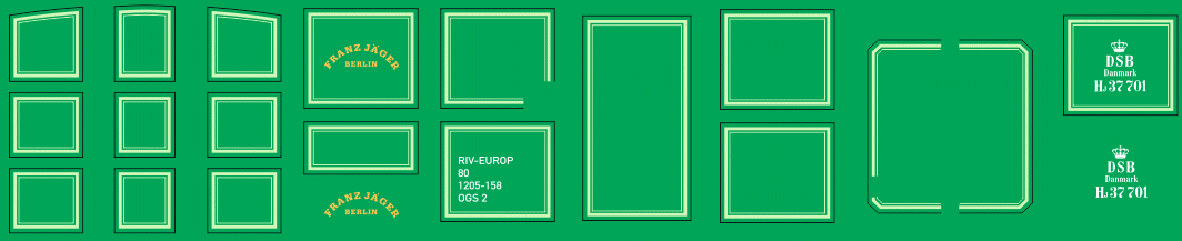 Decal TT für Tresorwagen der Olsenbande mit hellgrünen Zierleisen - Bausatz Die Zierlinien sind bei diesem Artikel in Hellgrün gedruckt. Eine genaue Farbgebung ist nicht zu klären gewesen, da es im Film zu starken Reflexionen mit dem dunklen Grün und Umgebungsfarben kommt. Im Film ist der Wagen mit einer fiktiven UIC-Beschriftung (Epoche 4) beschriftet. Um auch den Liebhabern früherer Epochen den Einsatz zu ermöglichen, liegt jedem Bogen ein separates Beschriftungsfeld in der für die DSB typischen Beschriftung vor Epoche 4 bei.