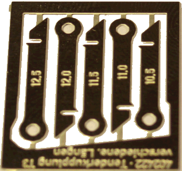 Ätzteil TT Ersatzteil Tenderkupplung pr. T3 / BR 89.60 (Jatt / Tillig) in versch. Längen - Bausatz Bausatz bzw. Ersatzteil Tenderkupplung pr. T3 / BR 89.60 von Jatt oder Tillig in versch. Längen. Mit dem Ersatzteil können gebrochene bzw an der Öse gerissene Tenderkupplungen ersetzt werden. Dem Bausatz liegen Kupplungen in 5 verschiedenen Längen bei. Somit kann entsprechend der Radien der Anlage der Lok-Tender-Abstand gekürzt werden.