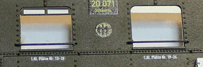 Die Lüfterklappen (Ätzteil) werden in Wagenfarbe lackiert. Sie werden nur auf der Abteilseite angebaut. Die entsprechenden Fenster werden im oberen Bereich cremeweiß lackiert. Die Fenster werden von hinten eingesteckt und zum Beispiel mit Weißleim verklebt. Auch B7000 Kleber funktioniert. Zum Ankleben keinen Sekundenkleber nutzen, da er die Fenster zerstört! Auf dem Bild rechts ein Fenster mit aufgesetzter Lüfterklappe. Rechts das Fenster ist im oberen Bereich cremeweiß lackiert.