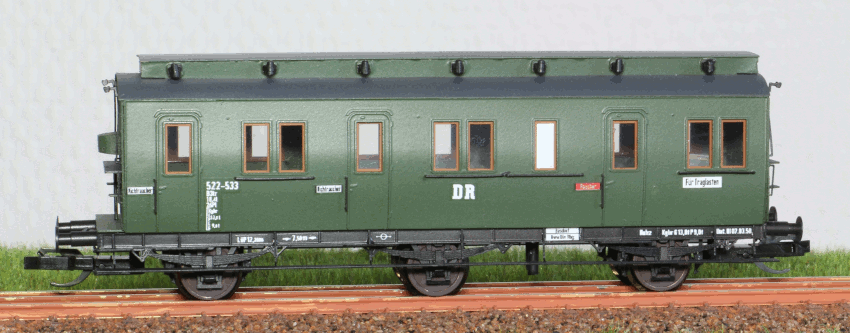 Mit diesem Bausatz lässt sich ein Modell des Wagens nach dem Umbau auf elektrische Beleuchtung, verschlossener Aborttür und entferntem Bremserhaus der DRG Ep.II oder der DR/DB Ep.III bauen.