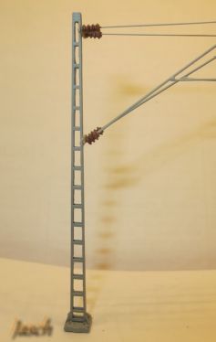 Ätzteil TT für einen Oberleitungsmast nach Vorbild DR Aufsetzmast mit Höhe 7500 mm und Breite 120 mm - Bausatz Bauanleitung herunterladen Bausatz aus Neusilber für einen Oberleitungsmast der DR. Es handelt sich dabei um einen Aufsetzflachmast mit 7,5 m Höhe und 120 mm Maststärke. Der Ausleger wird aus verschiedenen Drähten selbst hergestellt (siehe Anleitung). Bei der Auswahl der Masthöhe kommt es unter anderem auf das e-Maß an. Es bestimmt die Einsetztiefe gegenüber der Schienenoberkante (SOK). Ist e positiv liegt die Einsetztiefe unter SOK, ist e negativ, dann über SOK. Bei e-Maß = 0 ist der 7,5 m Mast für die Systemhöhe 1,40 m und 5,50 m Regelfahrdrahthöhe zu verwenden. Bei tieferen Maststandpunkten sind entsprechend längere Masten zu verwenden. Längere Masten werden an Bahnübergängen benötigt, um die Fahrdrahthöhe anzuheben. Außerdem für Masten mit Mastschaltern, Speiseleitungsmaste (siehe Artikel zu Speiseleitungsträgern). Die Wahl der Stärke des Mastes richtet sich nach dem Lasteintrag und der Höhe des Mastes. So wurden an gerader Strecke die dünneren Maste aufgestellt, in Kurven Maste mit stärkerem Profil. Maste die Mastschalter oder Speiseleitungsträger tragen, werden ebenfalls stärker ausgeführt.