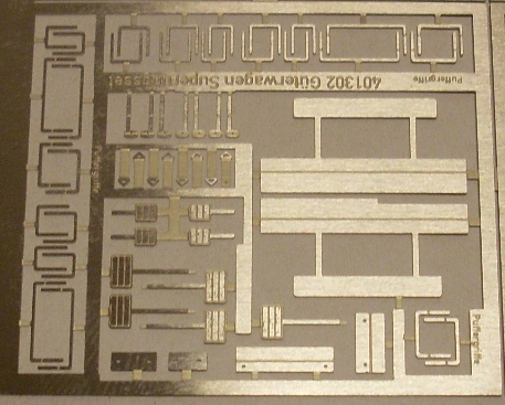 Ätzteil TT zum Supern von Güterwagen - Bausatz Bausatz zum Supern von Güterwagen mit breiten Türen (z.B. G Dresden). Dem Bausatz liegen neben den Türtritten auch Rangiertritte, diverse Griffstangen, Schlußscheibenhalter u.a. bei. Sie werten die Wagen durch ihr filigranes Erscheinungsbild deutlich auf.