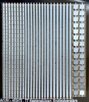 Ätzteil TT für filigrane Kastenstützen & Endfeldverstärkungen zum Selbst- & Umbau von Güterwagen - Bausatz Bausatz Kastenstützen und Endfeldverstärkungen zum Selbstbau bzw. Umbau von Güterwagen. Dem Bausatz liegen verschiedene Formen von Kastenstützen mit und ohne Schraubenimitationen in verschiedenen Breiten bei. Außerdem ist der Bausatz ergänzt um Knotenbleche für eingeschweißte Endfeldverstärkungen von Güterwagen. Die Teile werden mit der Schere auf passende Länge geschnitten und auf die Modelle geklebt.