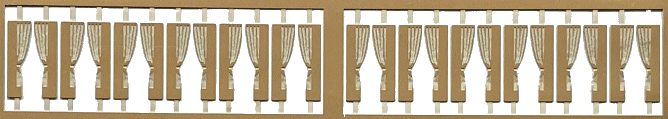 Ätzteil TT Gardinen für Personenwagen für 12 Fenster mit einer Höhe zwischen 7 und 8 mm - Bausatz Ätzteil mit Gardinen für TT-Personenwagen. Bausatz für 12 Fenster mit einer Höhe zwischen 7 und 8 mm. Ätzblech passend lackieren und hinter die Scheibe Kleben.