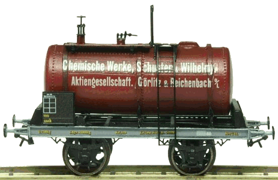 Ätzteil TT für einen Kesselwagen der Firma Schuster-Wilhelm aus Görlitz (Epoche 1) - Bausatz Download Bauanleitung TT-Ätzbausatz für einen Kesselwagen. Gebaut wurde der Wagen von der AG für Fabrikation von Eisenbahn-Material zu Görlitz. Auftraggeber des Originals war die Schuster & Wilhelm AG, Görlitz/Reichenbach. Es handelt sich um einen Privatgüterwagen, der in Epoche I im Wagenpark der Königlich Sächsischen Staatseisenbahnen (K. Sächs. Sts. E. B.) eingestellt war. Ein Einsatz in Epoche II und III ist wahrscheinlich.